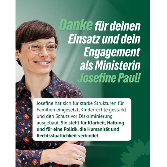 Josefine hat politische Verantwortung stets mit Klarheit, Verlässlichkeit und Haltung übernommen. Sie hat sich für starke Strukturen für Familien eingesetzt, Kinderrechte gestärkt und sich in der Politik für eine vielfältige Gesellschaft eingesetzt, die verschiedene Perspektiven verbindet. Mit dem Abschiebestopp in den Iran hat sie sich bspw. klar für migrantische Menschen ausgesprochen.